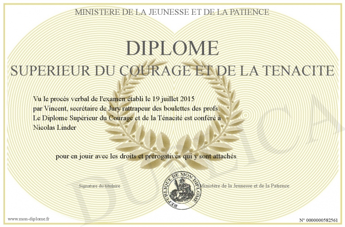 Envoyez par email votre Diplôme Supérieur du Courage et de la Ténacité personalisé
