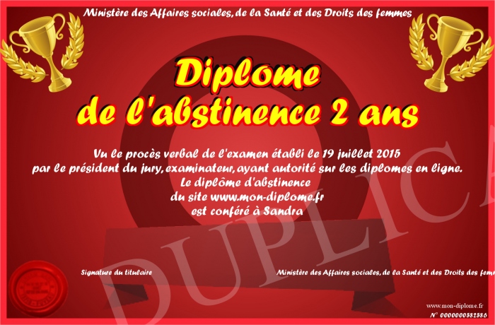 Envoyez par email votre Diplôme de l'abstinence 2 ans personalisé