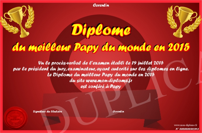 Envoyez par email votre Diplôme du meilleur Papy du monde en 2015 personalisé