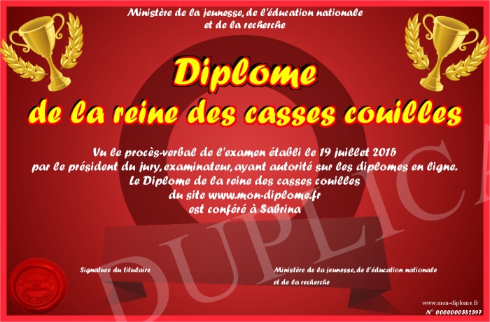 Envoyez par email votre Diplôme de la reine des casses couilles personalisé