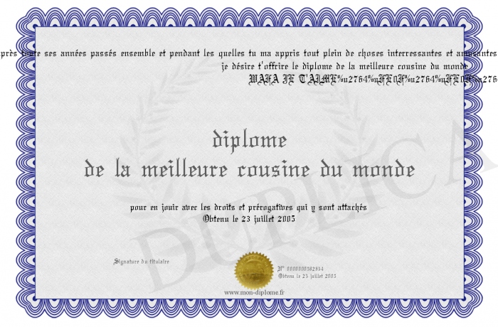 Envoyez par email votre diplome de la meilleure cousine du monde personalisé