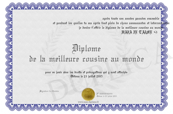 Envoyez par email votre Diplôme de la meilleure cousine au monde personalisé