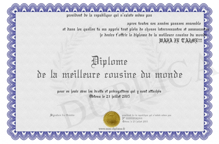 Envoyez par email votre Diplôme de la meilleure cousine du monde personalisé