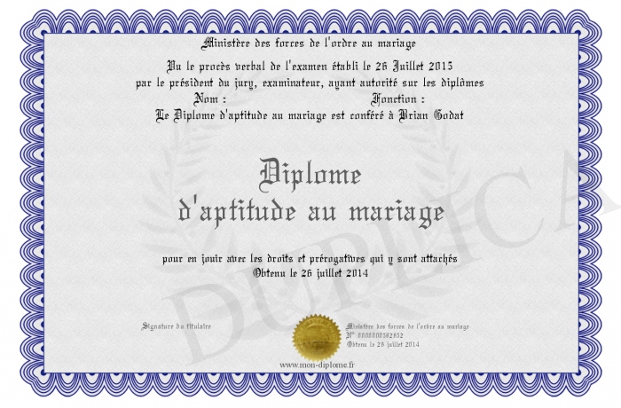 Envoyez par email votre Diplôme d'aptitude au mariage personalisé