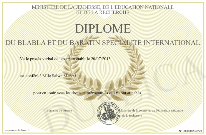 Envoyez par email votre Diplome du blabla et du baratin spécialité international personalisé