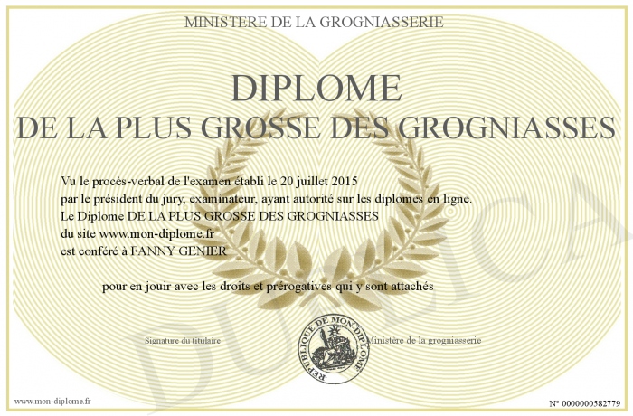 Envoyez par email votre Diplôme DE LA PLUS GROSSE DES GROGNIASSES personalisé