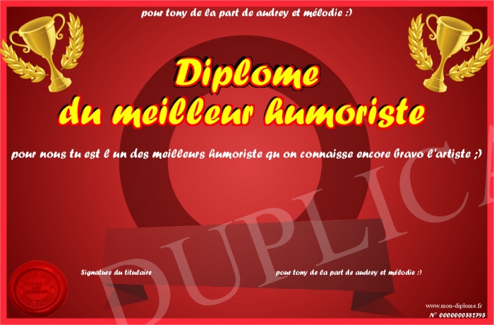Envoyez par email votre Diplôme du meilleur humoriste personalisé