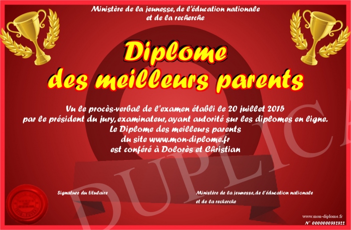 Envoyez par email votre Diplôme des meilleurs parents personalisé