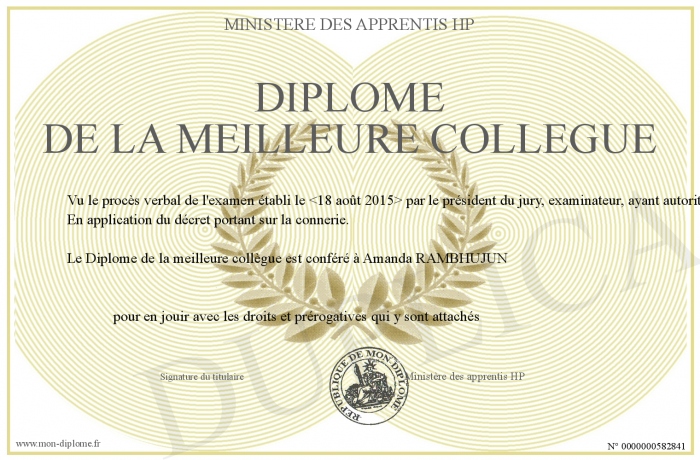 Envoyez par email votre Diplôme de la meilleure collègue personalisé