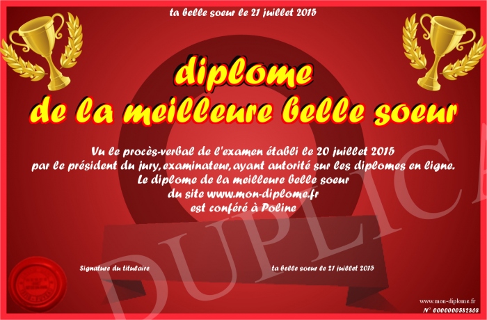 Envoyez par email votre diplôme de la meilleure belle soeur personalisé