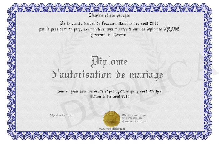 Envoyez par email votre Diplôme d'autorisation de mariage personalisé