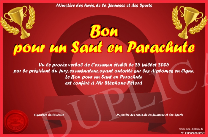 Envoyez par email votre Bon pour un Saut en Parachute personalisé