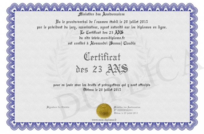 Envoyez par email votre Certificat des 23 ANS personalisé