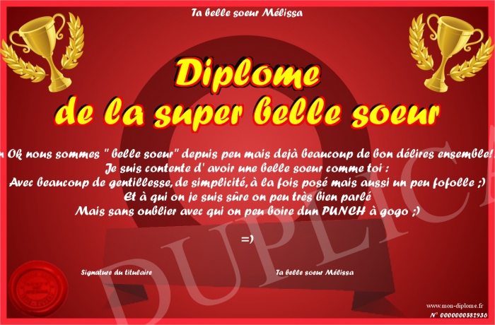 Envoyez par email votre Diplôme de la super belle soeur personalisé