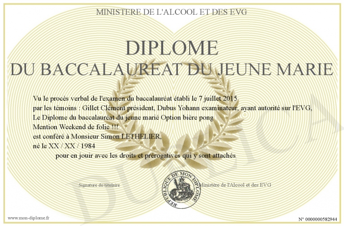 Envoyez par email votre Diplôme du baccalauréat du jeune marié personalisé