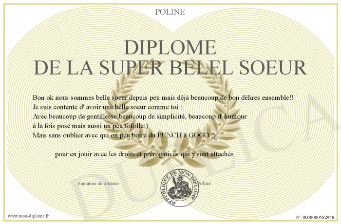 Envoyez par email votre Diplôme de la super belel soeur personalisé