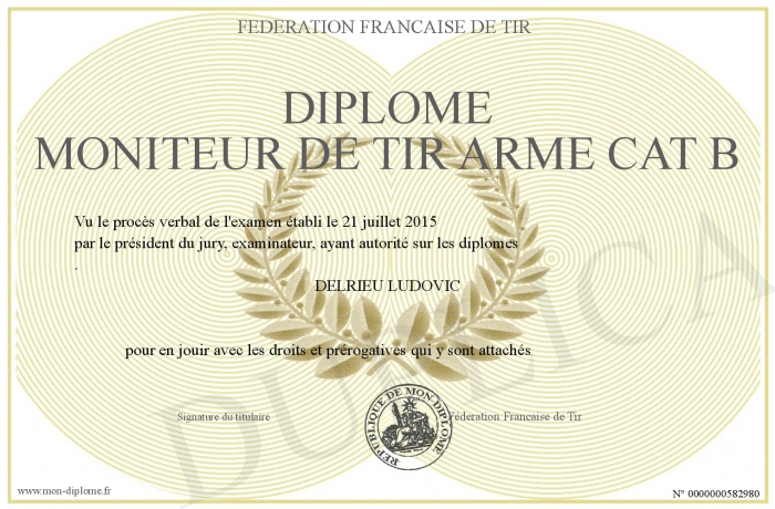 Envoyez par email votre Diplôme Moniteur de tir arme Cat B personalisé