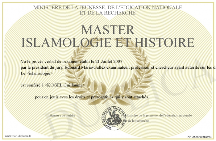 Envoyez par email votre MASTER ISLAMOLOGIE et HISTOIRE personalisé
