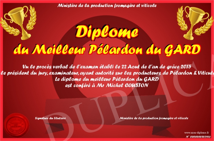 Envoyez par email votre Diplôme du Meilleur Pélardon du GARD personalisé