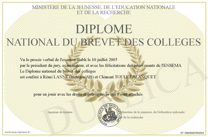 Envoyez par email votre Diplôme national du brevet des collèges personalisé