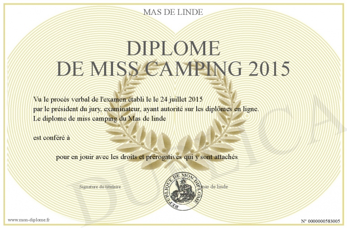 Envoyez par email votre Diplome de miss camping 2015 personalisé