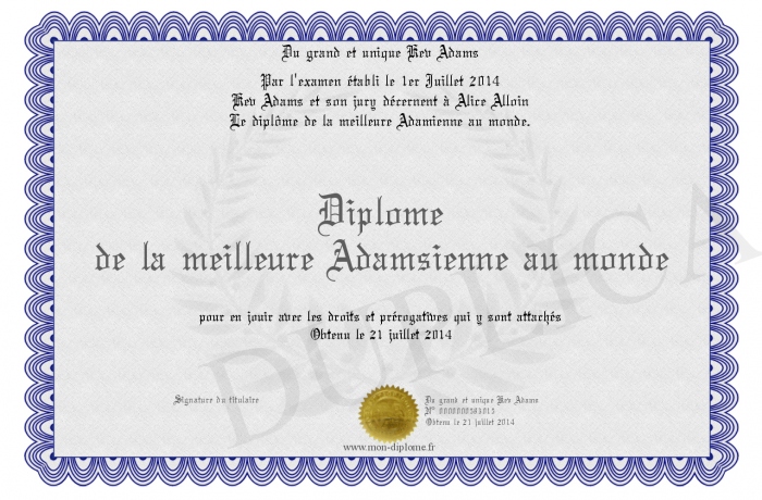 Envoyez par email votre Diplôme de la meilleure Adamsienne au monde personalisé