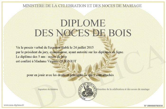 Envoyez par email votre Diplôme des noces de bois personalisé