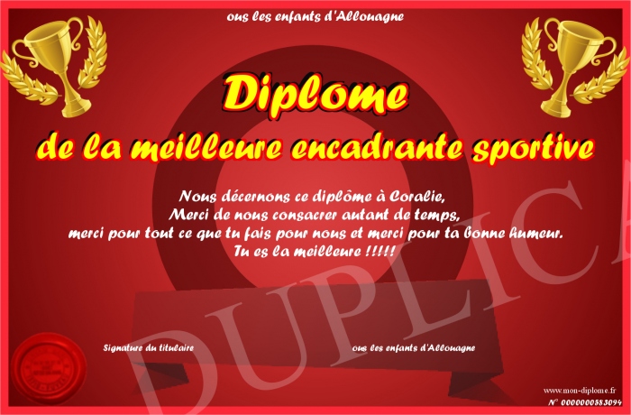 Envoyez par email votre Diplôme de la meilleure encadrante sportive personalisé