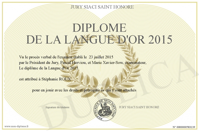Envoyez par email votre Diplôme de la Langue d'Or 2015 personalisé