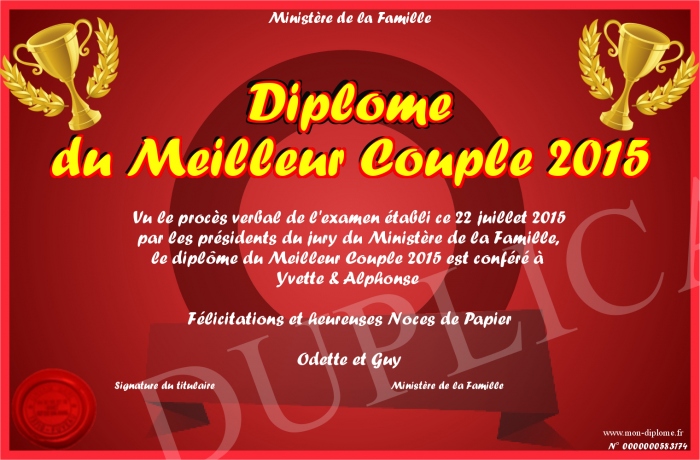 Envoyez par email votre Diplôme du Meilleur Couple 2015 personalisé