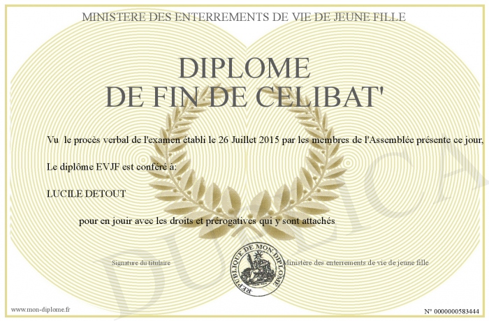 Envoyez par email votre Diplôme de fin de célibat' personalisé