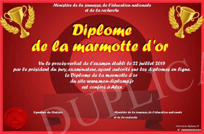 Envoyez par email votre Diplôme de la marmotte d'or personalisé