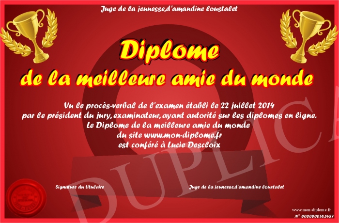 Envoyez par email votre Diplôme de la meilleure amie du monde personalisé