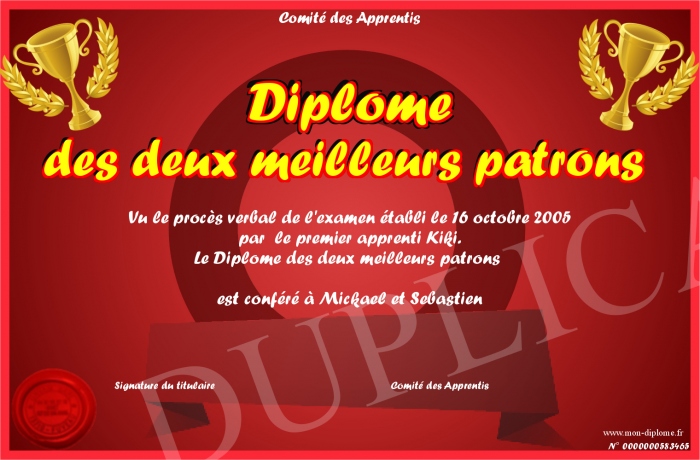 Envoyez par email votre Diplôme des deux meilleurs patrons personalisé