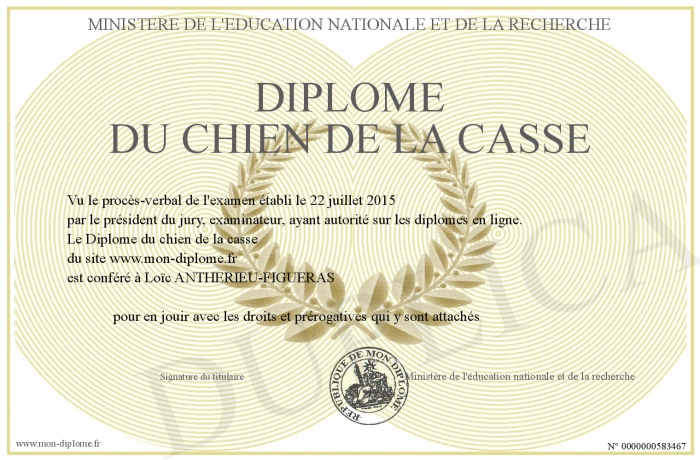 Envoyez par email votre Diplôme du chien de la casse personalisé