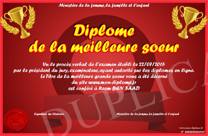 Envoyez par email votre Diplôme de la meilleure soeur personalisé