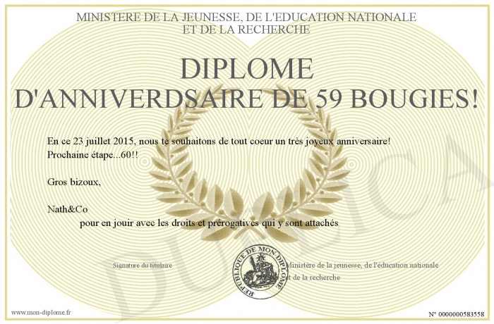 Envoyez par email votre Diplôme d'anniverdsaire de 59 bougies! personalisé