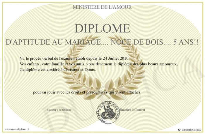 Envoyez par email votre Diplôme d'aptitude au mariage.... Noce de Bois.... 5 ans!! personalisé