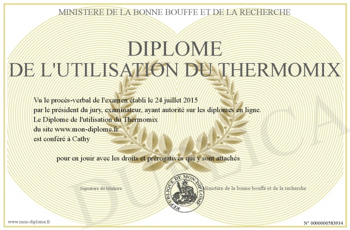 Envoyez par email votre Diplôme de l'utilisation du Thermomix personalisé