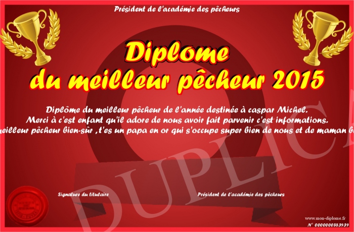 Envoyez par email votre Diplôme du meilleur pêcheur 2015 personalisé