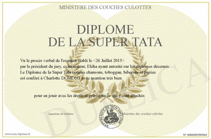 Envoyez par email votre Diplôme de la Super Tata personalisé