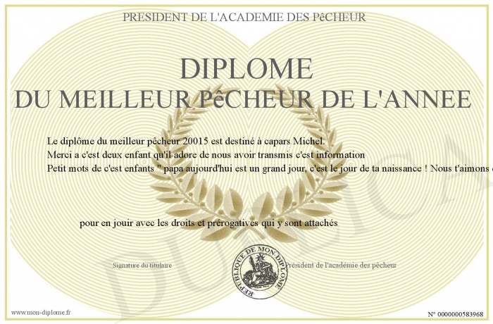 Envoyez par email votre Diplôme du meilleur pêcheur de l'année personalisé