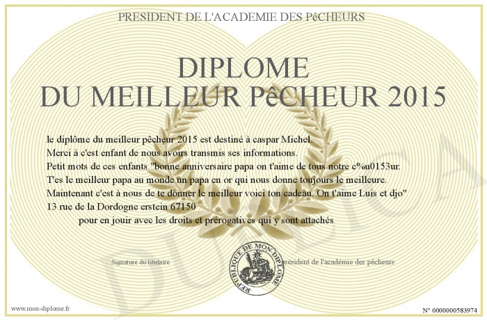 Envoyez par email votre Diplôme du meilleur pêcheur 2015 personalisé