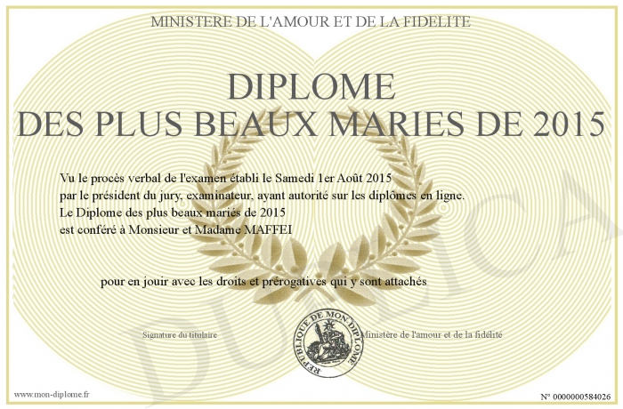 Envoyez par email votre Diplôme des plus beaux mariés de 2015 personalisé