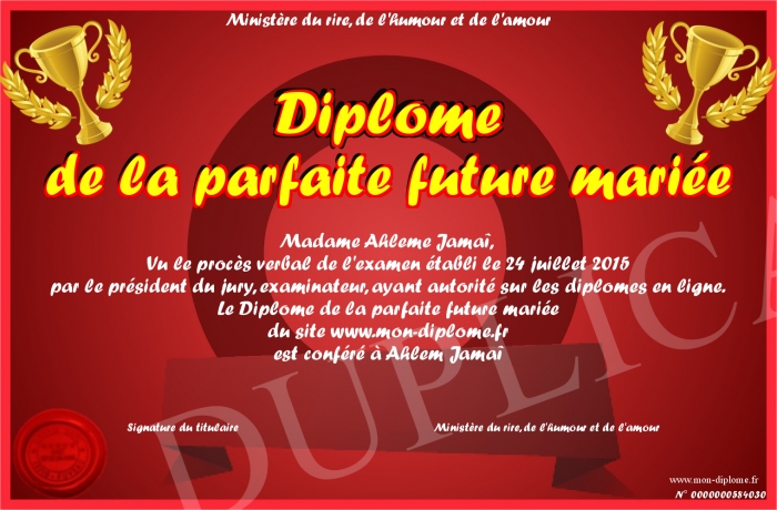 Envoyez par email votre Diplôme de la parfaite future mariée personalisé