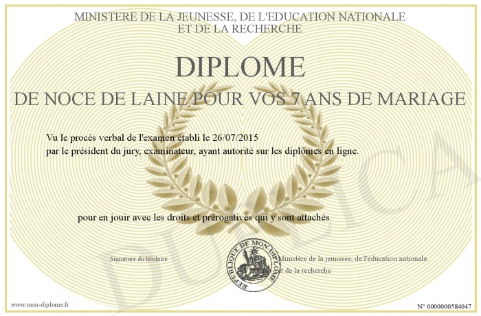 Envoyez par email votre Diplôme de noce de laine pour vos 7 ans de Mariage personalisé