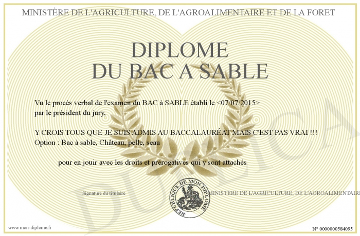 Envoyez par email votre DIPLOME DU BAC A SABLE personalisé