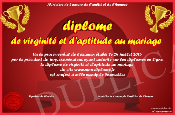 Envoyez par email votre diplôme de virginité et d'aptitude au mariage personalisé