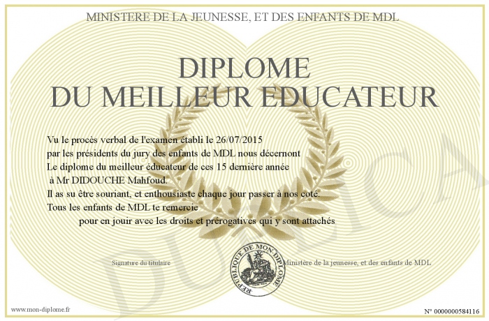 Envoyez par email votre Diplôme du meilleur éducateur personalisé