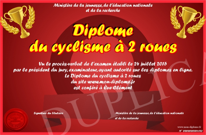 Envoyez par email votre Diplôme du cyclisme à 2 roues personalisé